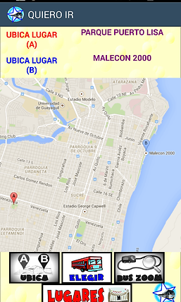 Al seleccionar una determinada línea de transporte, aparecerá un mapa mostrando la ruta de ese bus visualizada en una línea de color azul (ida) y otra línea de color rojo (retorno), además muestra los 2 puntos de referencia previamente seleccionados para que de esta manera el usuario pueda saber que tan cerca lo dejaría la ruta seleccionada del sector al cual desea llegar, también informa en la parte inferior sobre las calles más cercanas al sector donde se ubican los puntos de referencia en las cuales podría el usuario subir o bajarse dependiendo de la dirección a la que vaya la línea de bus (NS - de Norte a Sur) o (SN de Sur a Norte)